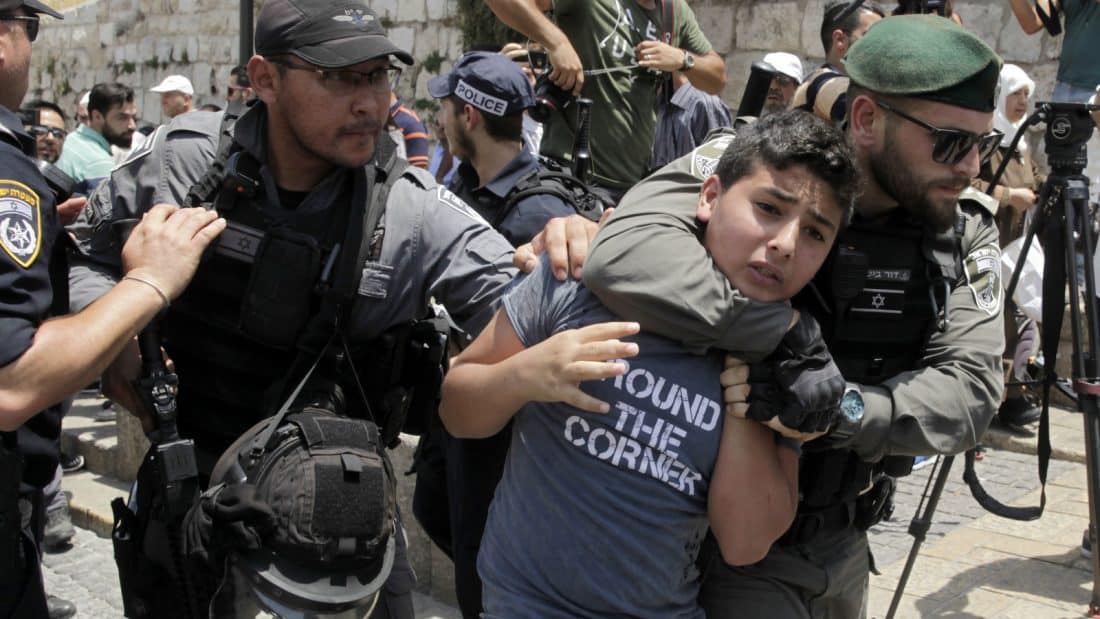 Israeli border police officers detain a Palestinian youth in Jerusalem's Old City, Monday, July 17, 2017. Islamic leaders called on Muslims on Monday to boycott a Jerusalem holy site at the heart of the Israeli-Palestinian conflict in a gesture of protest after Israel set up metal detectors at the site's entrance gates following a deadly Arab attack there last week. (AP Photo/Mahmoud Illean)